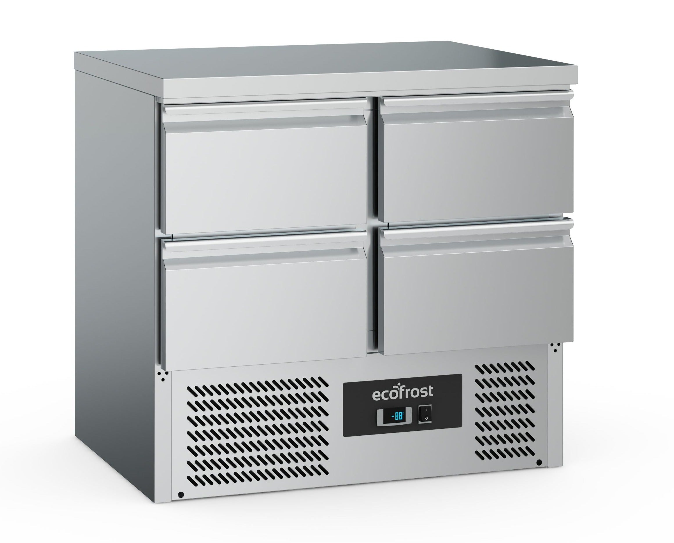 Vi har fundet Kølebord – Skuffer – Gn fra Ecofrost hos Maxigastro.com i kategorien Professionelle Køle- Og Fryseprodukter Til Køkkener Og Restaurationsbranchen. Kølebord fra Ecofrost i rigtig god kvalitet med 4 skuffer – udvendigt udført i rustfrit stål og med tydelig angivelse af temperatur på forsiden. Køleenheden er placeret i bunden, hvilket giver et pladsbesparende kølebord. Bredde (mm) 900Dybde (mm) 700Højd